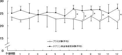 *:プラセボ群とテアニン高含有緑茶抹群の有意差