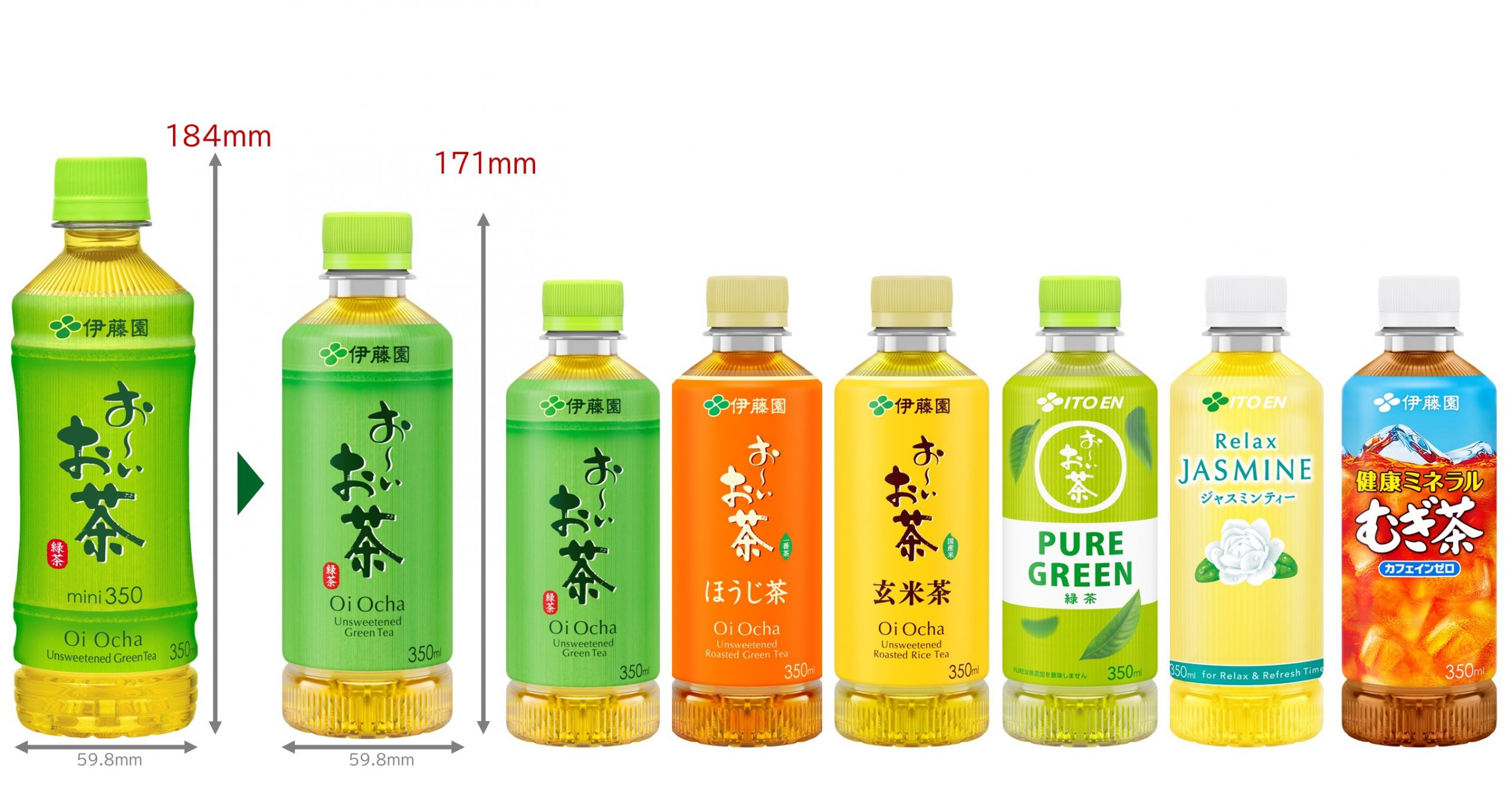 左から「お~いお茶 緑茶」「同 ほうじ茶」「同 玄米茶」「同 PURE GREEN」「Relax JASMINE」「健康ミネラルむぎ茶」