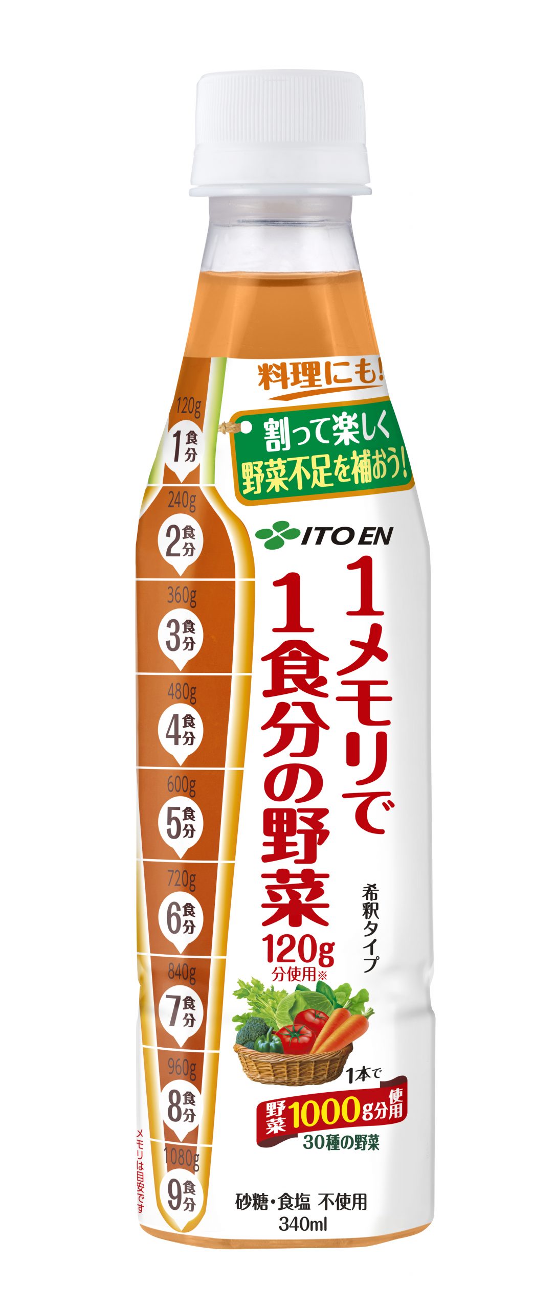 株式会社伊藤園(社長:本庄大介 本社:東京都渋谷区)は、メモリによって1食分の野菜120g分(※1)をひと目で確認でき、牛乳や豆乳と割ることで楽しみながらおいしく野菜不足を補える希釈タイプの野菜混合飲料「1メモリで1食分の野菜」を10月6日(月)に新発売します。