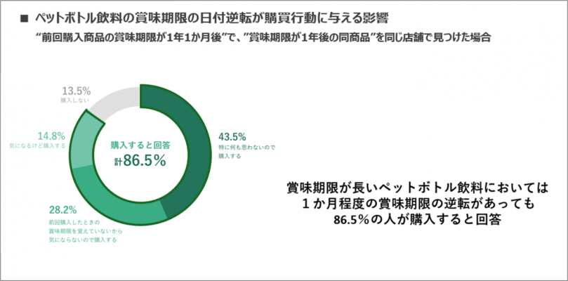 他の食品と比較し、賞味期間が長いペットボトル飲料においては1か月程度の賞味期限の逆転があっても9割近くのお客様が購入すると回答しました。以上のことから、ペットボトル飲料においては、賞味期限の日付逆転がお客様の購買行動に与える影響は限定的と考えられます。