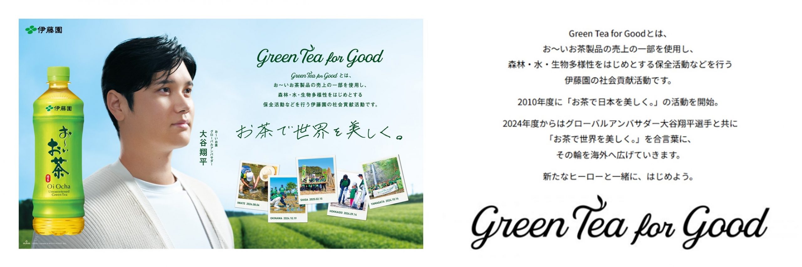 「Green Tea for Good」とは、グローバルアンバサダーの大谷選手と当社で2024年7月に立ち上げたグローバル社会貢献プロジェクトです。第1弾の取組みとして、当社が2010年度から取組んでいる「お茶で日本を美しく。」プロジェクトを世界にも広がるようにアップデート。2024年7月から「お~いお茶」ブランドの飲料・リーフ製品の売上の一部などを活用し、日本全国での活動に加えてアメリカ・カリフォルニア州トーランスでの桜の植樹活動や、アメリカ・ハワイ・オアフ島カピオラニ公園での清掃活動をはじめ、世界5か国の地域で保全活動を実施するなど展開を拡大しています。さらに2025年からは、大谷選手が恩師から受けた「ゴミを拾うことは幸福を拾うこと」という教えに紐付き、実際に試合中にゴミを拾う姿から着想を得たゴミの収集や分別を推進する活動「ゴミ拾いしなくっ茶」を発足し、MLB™ TOKYO SERIES presented by Guggenheimの開幕戦や、大谷選手の母校であり「ゴミを拾う」「掃除をする」文化が根付く花巻東高等学校の皆様とともに活動を実施しています。