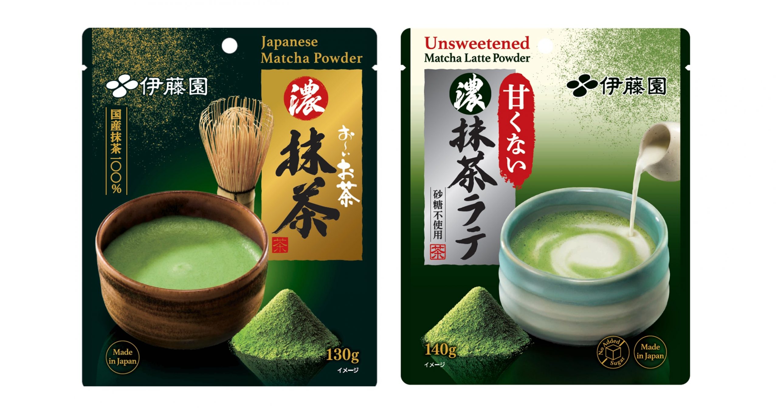 左から「お~いお茶 濃抹茶」(粉末製品)、「甘くない 濃抹茶ラテ」(粉末製品)