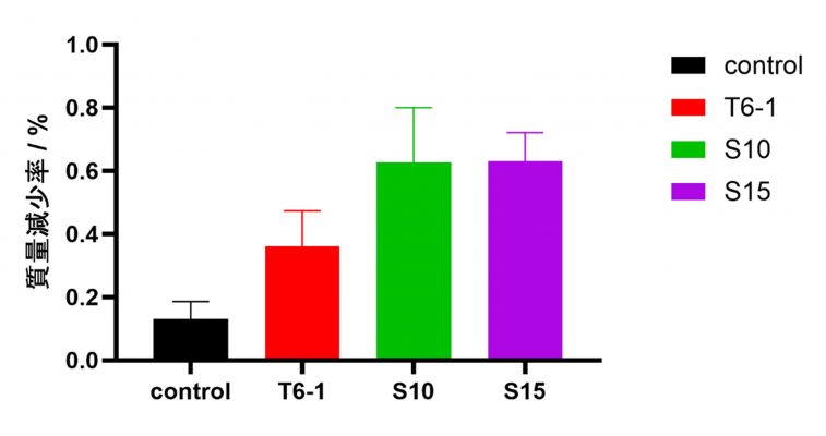 図2 T6-1, S10, S15によるP-Life含有PSシートの質量減少率