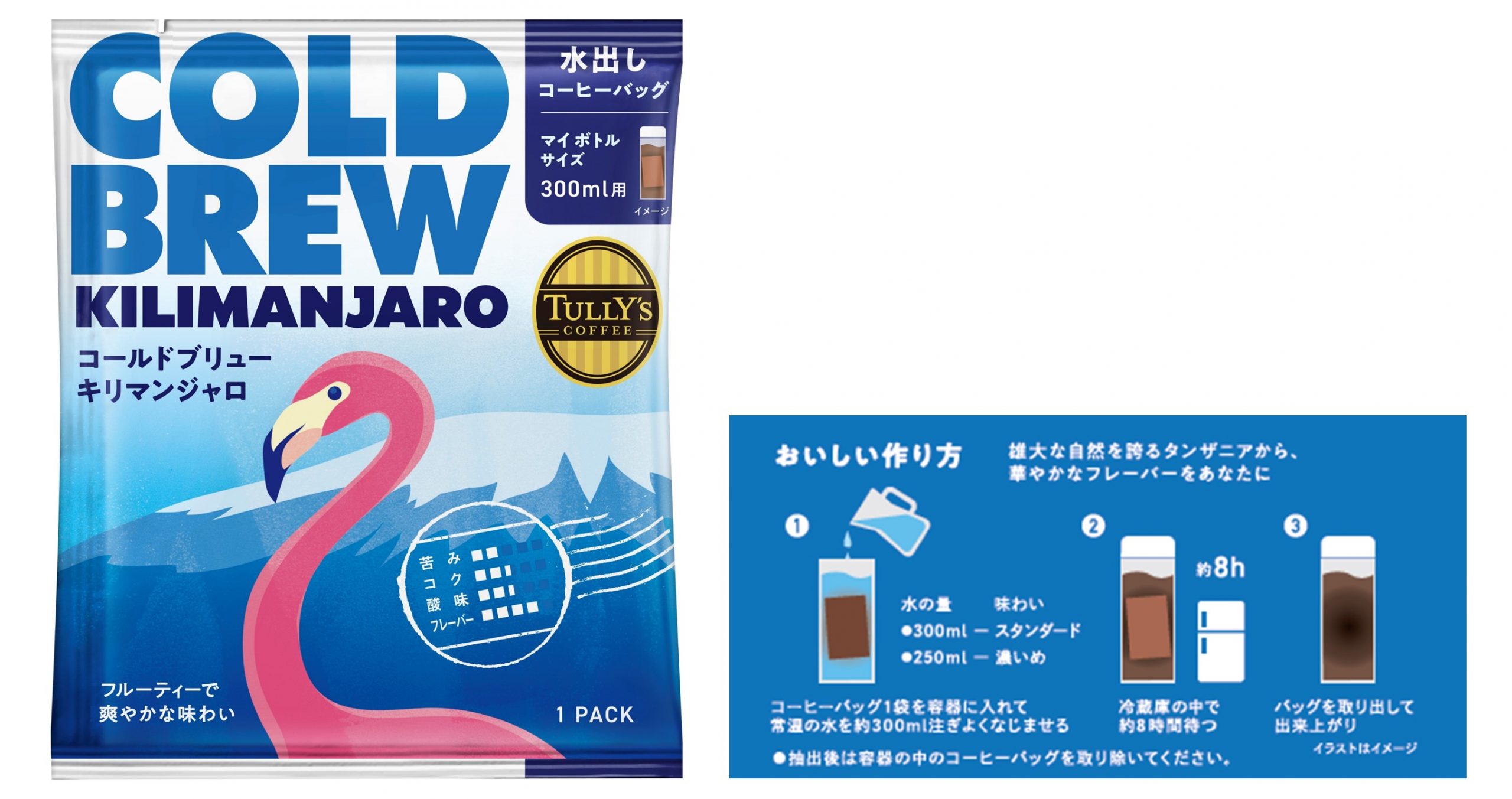 「TULLY’S COFFEE COLD BREW KILIMANJARO」(1 PACK)は、当社担当者がタンザニアの生産者と共同開発したキリマンジャロ豆を100%使用した、華やかな香りが特長の水出しコーヒーバッグです。マイボトルユーザーに好適なサイズ(300ml抽出)設計のため、通勤・通学時や外出先などさまざまなシーンで手軽に本格的な水出しコーヒーをお楽しみいただけます。