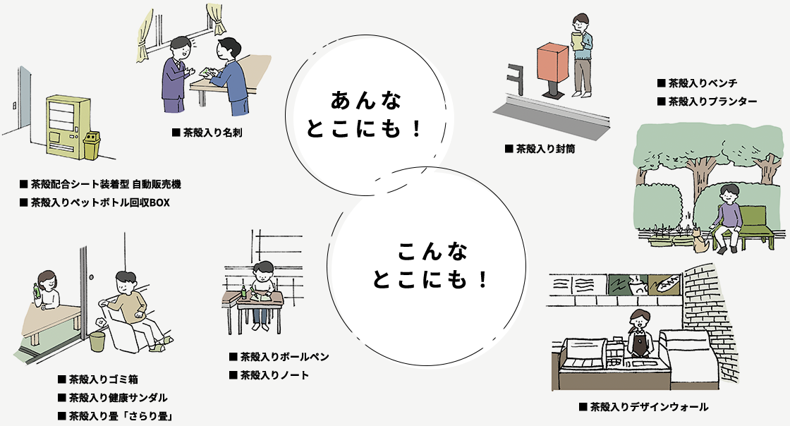 そのような中、2001年に茶殻を含水のまま常温保存(輸送)して、工業製品の代替原料に活用する独自技術「茶殻リサイクルシステム」を確立しました。この技術により、これまで必要としていた乾燥工程も不要となったため、通常茶殻を代替原料化する際に生じる燃料消費や二酸化炭素発生も抑制します。この技術確立以来、多くの「茶殻アップサイクル(リサイクル)製品」を、様々な協力企業と共に開発しています。
