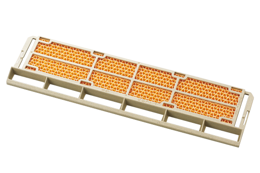 茶殻を練り込んだ樹脂を使用したフィルターホルダーの色は、自然由来の緑色をしているため、お客さまが掃除したり、交換したりするときに分かりやすいんです。このホルダーの開発には相当な試行錯誤を重ねました。茶殻樹脂を溶かして成型するフィルターホルダーは、それまでのものと成形条件がかなり異なります。調整に調整を重ね、丁度良い茶殻の配合率を見つけました。実は、家庭用エアコンは年間約900万台という売り上げ台数を誇る成熟した市場。もちろん各社それぞれが空気清浄機能を持っており、差別化が難しいのが現状です。そんななかで、茶殻を再利用した環境に優しい製品であることをアピールできるのは、商品価値の向上にも効果的です。